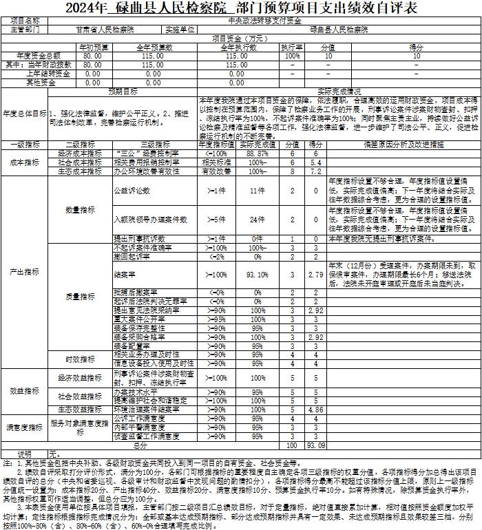 1.“中央政法转移支付资金”项目绩效自评情况:根据年初设定的绩效目标,项目绩效自评得分为93.09分。项目全年预算数为115.00万元,执行数为115.00万元,完成预算的100.00%。项目绩效目标完成情况:通过本项目资金的保障,依法履职,合理高效的运用财政资金,项目成本得以控制在预算范围内;同时聚焦主责主业,持续做好公益诉讼检察及精准监督等各项工作,强化法律监督,进一步维护了司法公平、正义。发现的主要问题及原因:成本指标及公益诉讼数部分指标设置不够合理、准确原因是对绩效指标设置的理解不够到位。下一步改进措施:结合工作计划及往年数据,综合考虑,更为科学、合理的设置指标内容。中央政法转移支付资金项目绩效自评情况: