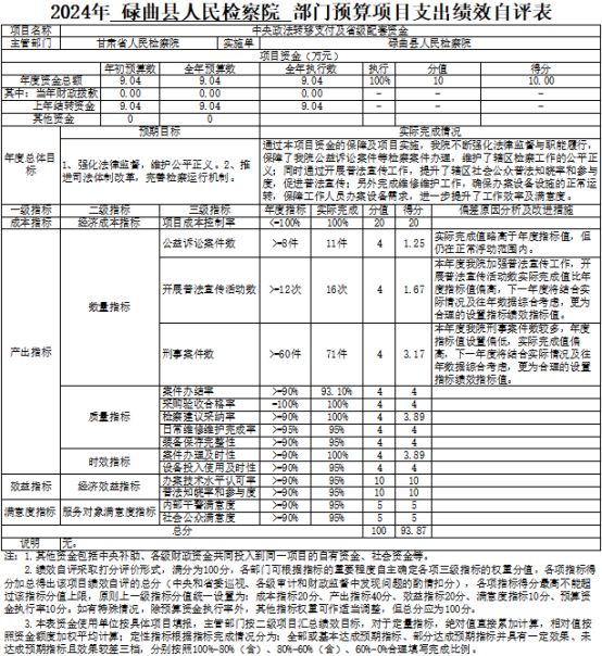 2.“中央政法转移支付及省级配套资金”项目绩效自评情况:根据年初设定的绩效目标,项目绩效自评得分为93.87分。项目全年预算数为9.04万元,执行数为9.04万元,完成预算的100.00%。项目绩效目标完成情况:通过本项目资金的保障,我院不断强化法律监督与职能履行,保障了公益诉讼案件等检察案件办理;同时通过开展普法宣传工作,提升了辖区社会公众普法知晓率和参与度;另外完成维修维护工作,确保办案设备设施的正常运转,进一步提升了工作效率及满意度。发现的主要问题及原因:部分数量指标目标值设置偏低,原因是未综合考量往年数据。下一步改进措施:结合工作计划及往年数据,综合考虑,更为科学、合理的设置指标内容。中央政法转移支付及省级配套资金项目绩效自评情况:“优”。